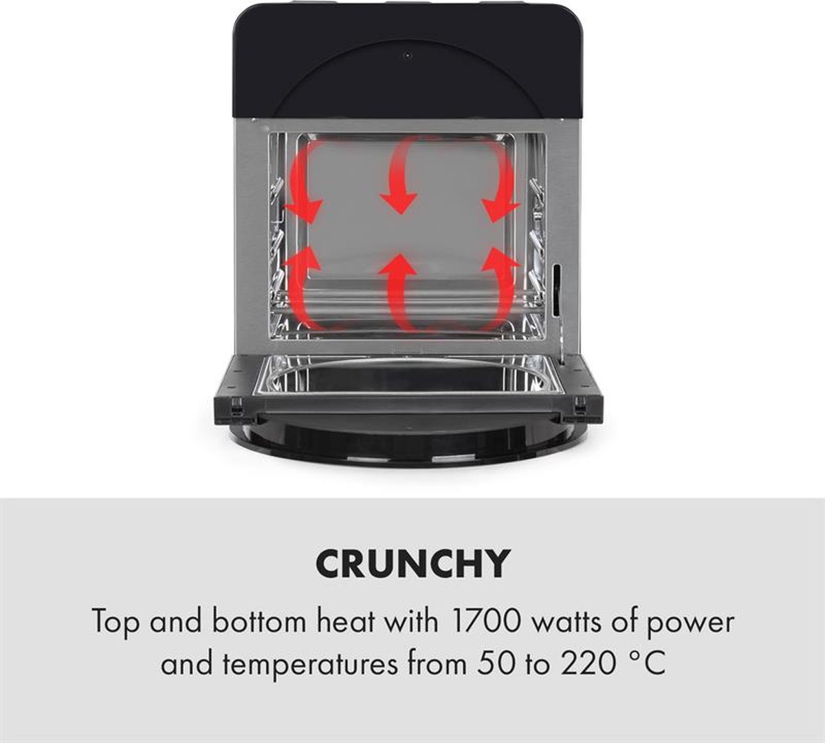 - Complete accessoires: Inclusief lekbak, rooster, mand en een draaispies met vleugelbouten en hendel, waardoor je elke keukenuitdaging aankunt. Maak bijvoorbeeld popcorn, bak taarten of dehydrereer fruit en groenten voor een gezonde snack.